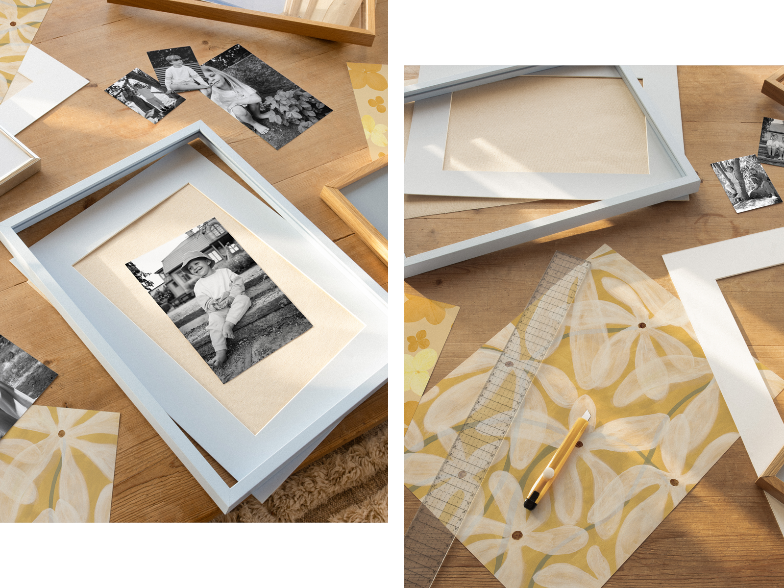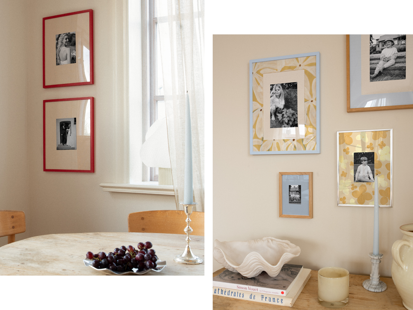 This time I wanted to experiment with our coloured frames and mounts paired with personal photographs. Personal photos often end up in quite classic frames – but I was curious about what would happen if you let the colour take up a little more space instead.