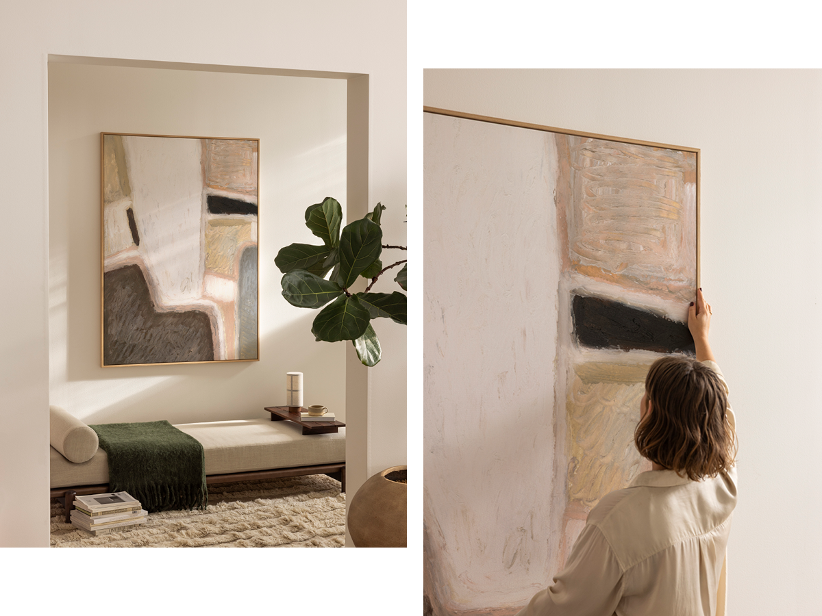 Hang your statement art above low furniture, such as a bench or daybed, and add sculptural greenery or soft textiles to complete the look. The result? A minimal yet striking style that feels contemporary, expressive, and entirely your own.