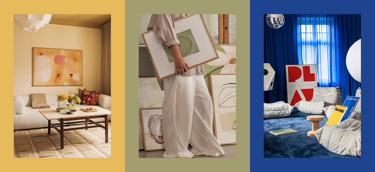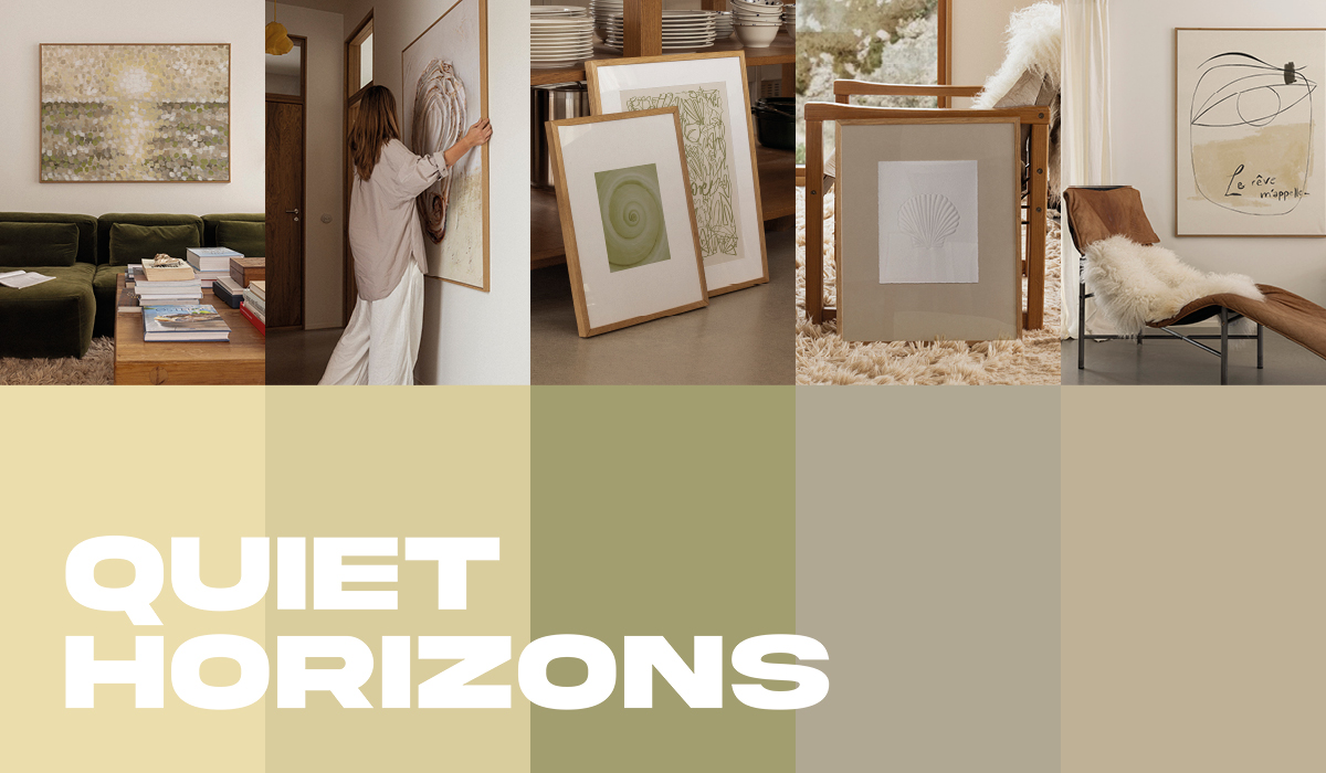 In curating these collections, we worked with specific colour palettes to ensure a cohesion between the pieces: sunset warmth, calming neutrals, and energising primary shades echo how people want to feel in their spaces. This makes artworks from the same collection very easy to combine, since each hue is designed to work in harmony with the next.