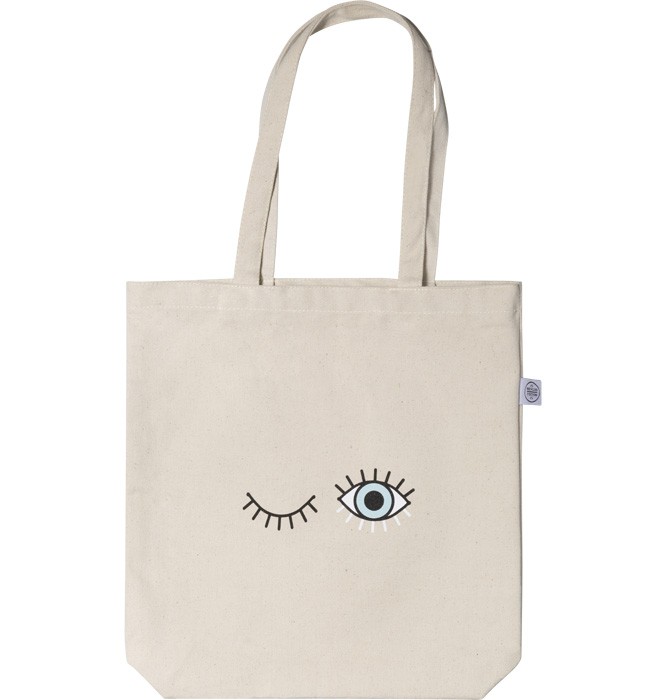 Handpicked design Tote bag in natural beige with one closed and one open eye. The trendy designs make our tote bags unique and something you'll be proud to wear! The tote bags in our limited edition collection are printed in Sweden and made of 100% recycled cotton.