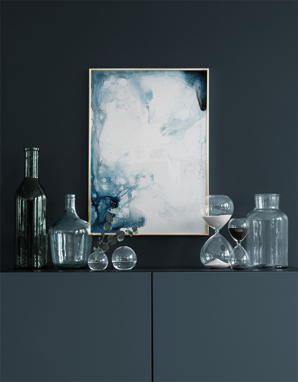Handpicked design Abstract art print of swirling blue figurations reminiscent of the ocean. Creates a sense of serenity in, for example, a bedroom. Combine with other posters and prints from our extensive range to create a vivid collage. The design was originally an acrylic painting on canvas, which means the texture of the canvas can still be seen!
