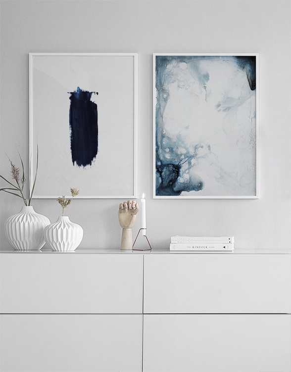 Abstrakt poster med konst i blått och vitt.