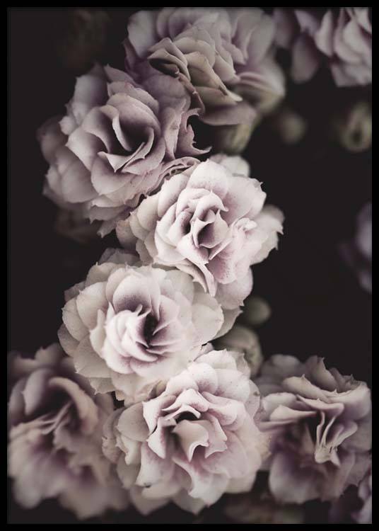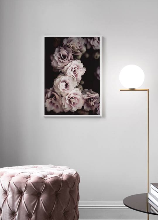 Handpicked design Dark botanical poster that fits perfectly in a romantic bedroom. The light purple flowers against the dark background create a luxurious feel and the poster goes perfectly with velvet furniture. Combine with a stylish typographic print to create an interesting contrast, or pair it with one of our other floral designs.