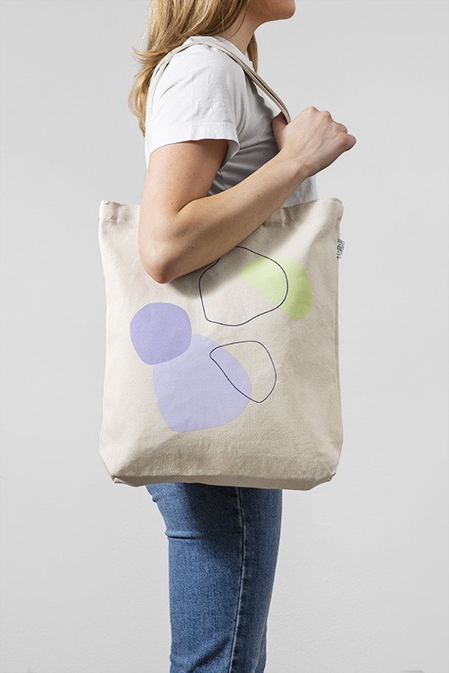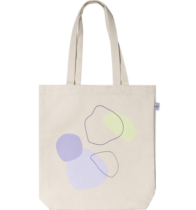 Handpicked design Tote bag in natural beige with purple and green abstract shapes. Make shopping more fun with a trendy tote bag, a sustainable as well as fashionable choice! The tote bags in our limited edition collection are printed in Sweden and made of 100% recycled cotton.