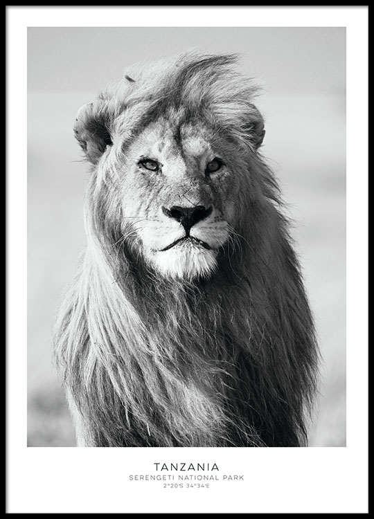 Handpicked design Photograph in black and white with portrait of a lion and the text "Tanzania" underneath. A truly regal and powerful image that can suit countless rooms and interior design styles. You can find more posters in a similar style in our Animals category!