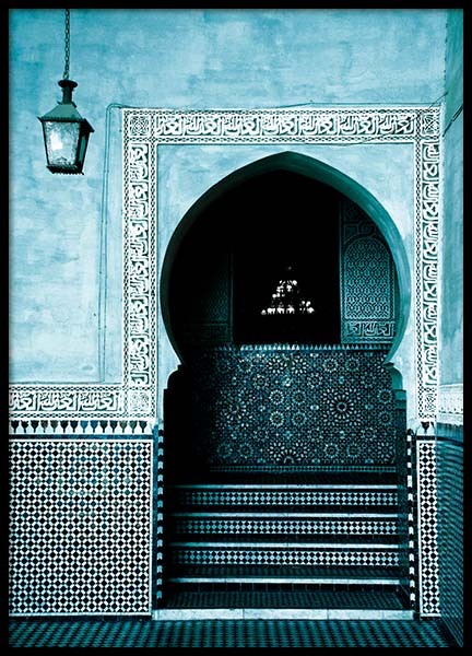 Handpicked design Photograph of a pool in a room with golden lamps, blue pillars and white, curved arches. This secret place holds both great tradition and artistry, making us fall in love every time. This print is part of Studio Amara, a photo collection shot by Desenio Design Studio in Marrakech.