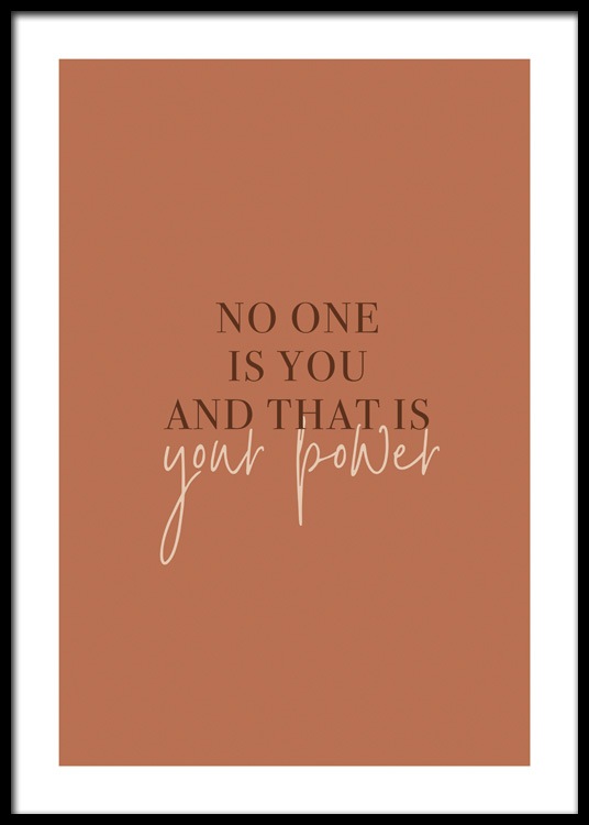 Handpicked design Text poster with the quote "No one is you and that is your power" in black and beige on a rusty red background. Fill your home with your favourite quotes, and remind yourself that you're unique and one of a kind!