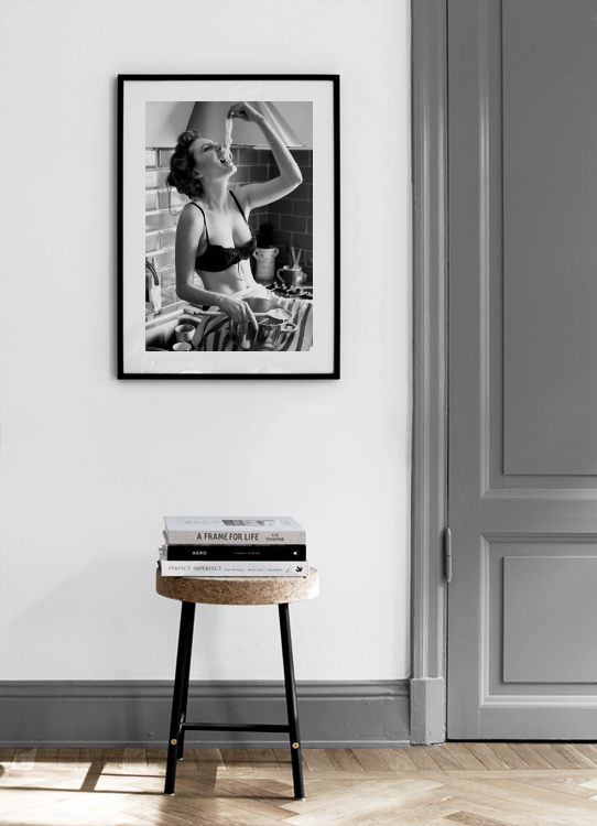 Handpicked design Photograph in black and white of a woman wearing a bra, eating pasta in the kitchen. Your kitchen will become a much more fun space to hang out in with some kitchen prints! The black and white style gives a retro feel.