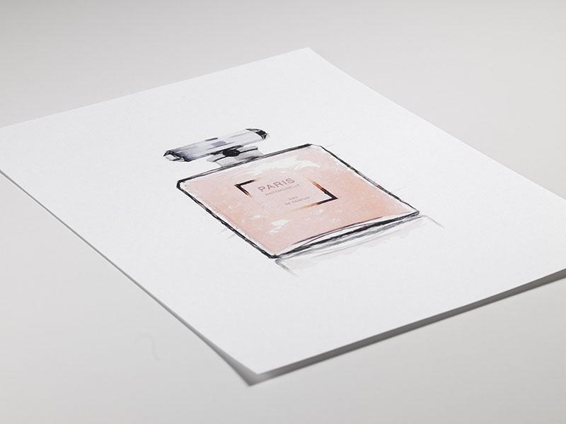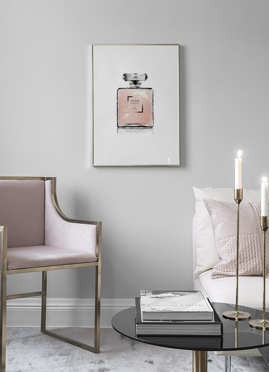 Handpicked design Watercolour illustration of a pink Chanel perfume bottle with the word Paris on it. This stylish poster looks just as nice hanging on the wall as it does leaning on a shelf, and with fashion posters you can with ease create a gallery wall that's on trend whilst keeping a stylish look!
