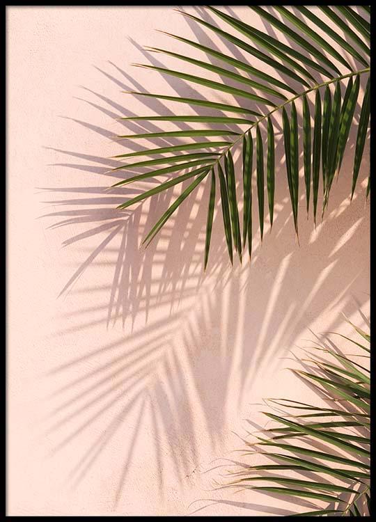 - Modern plant poster with palm leaves casting a shadow on a pink outside wall of a house.
