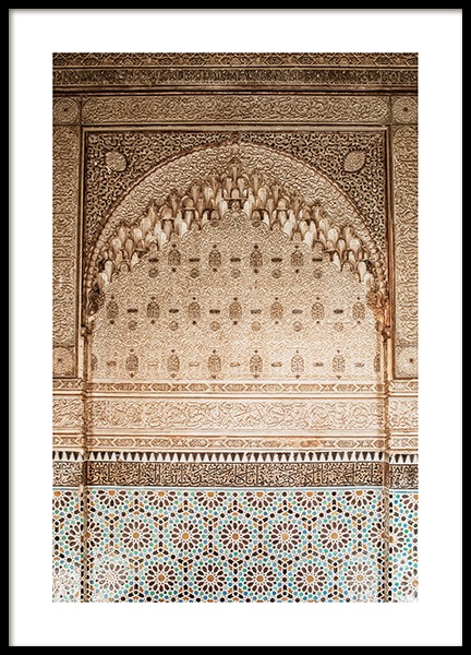 Handpicked design Photograph of a gold, curved arch with carved details in a temple. Filled with detail, crafted with great artistry, this place is truly magical. This print is part of Studio Amara, a photo collection shot by Desenio Design Studio in Marrakech.