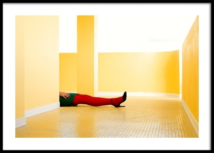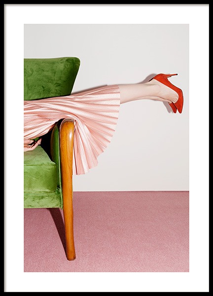 Handpicked design Photograph of a woman in red tights, green skirt and black heels, seemingly upside down.
