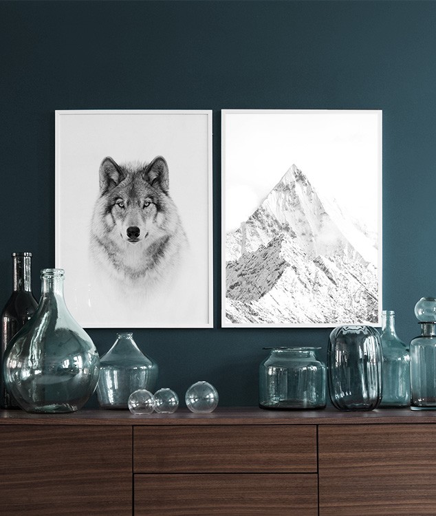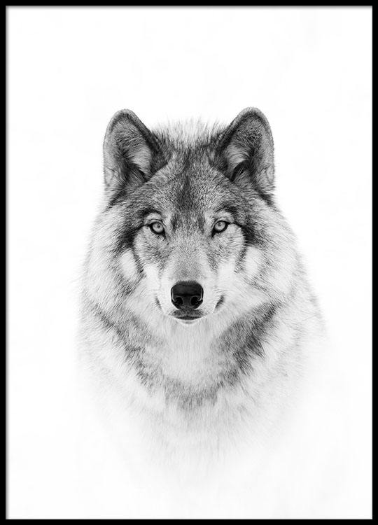Handpicked design Stylish black-and-white photo poster with an animal subject. This photo poster of a wolf against a white background is easy to combine with similar black-and-white posters and animal posters depicting other popular wild animals. Works equally well in a kid's room or the living room set in a simple black or white frame. Photographer: Jim Cumming