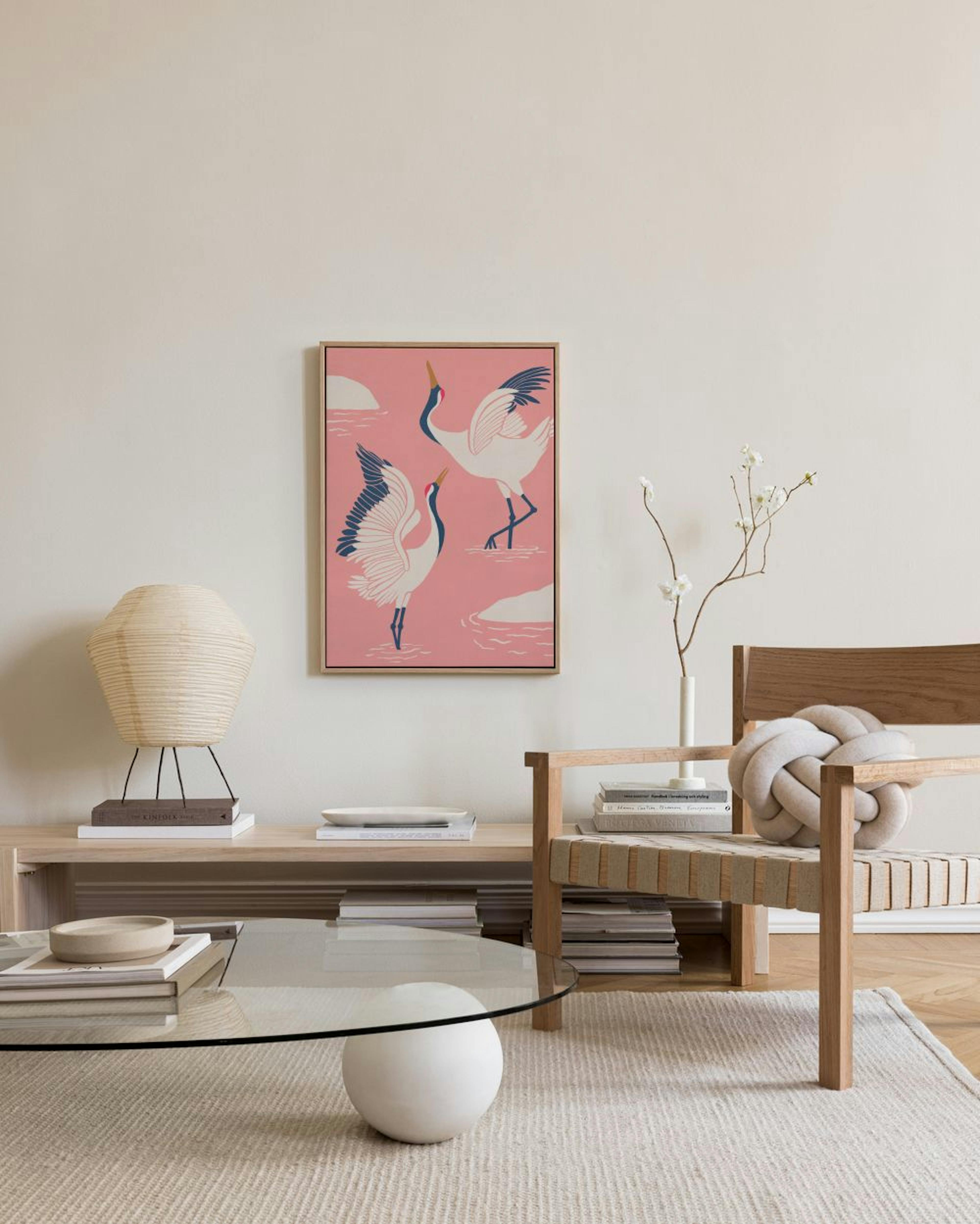 Two stylised white cranes with black wingtips, standing out against a pink background, captured in this beautiful canvas print, perfect to create a stunning gallery wall at home.