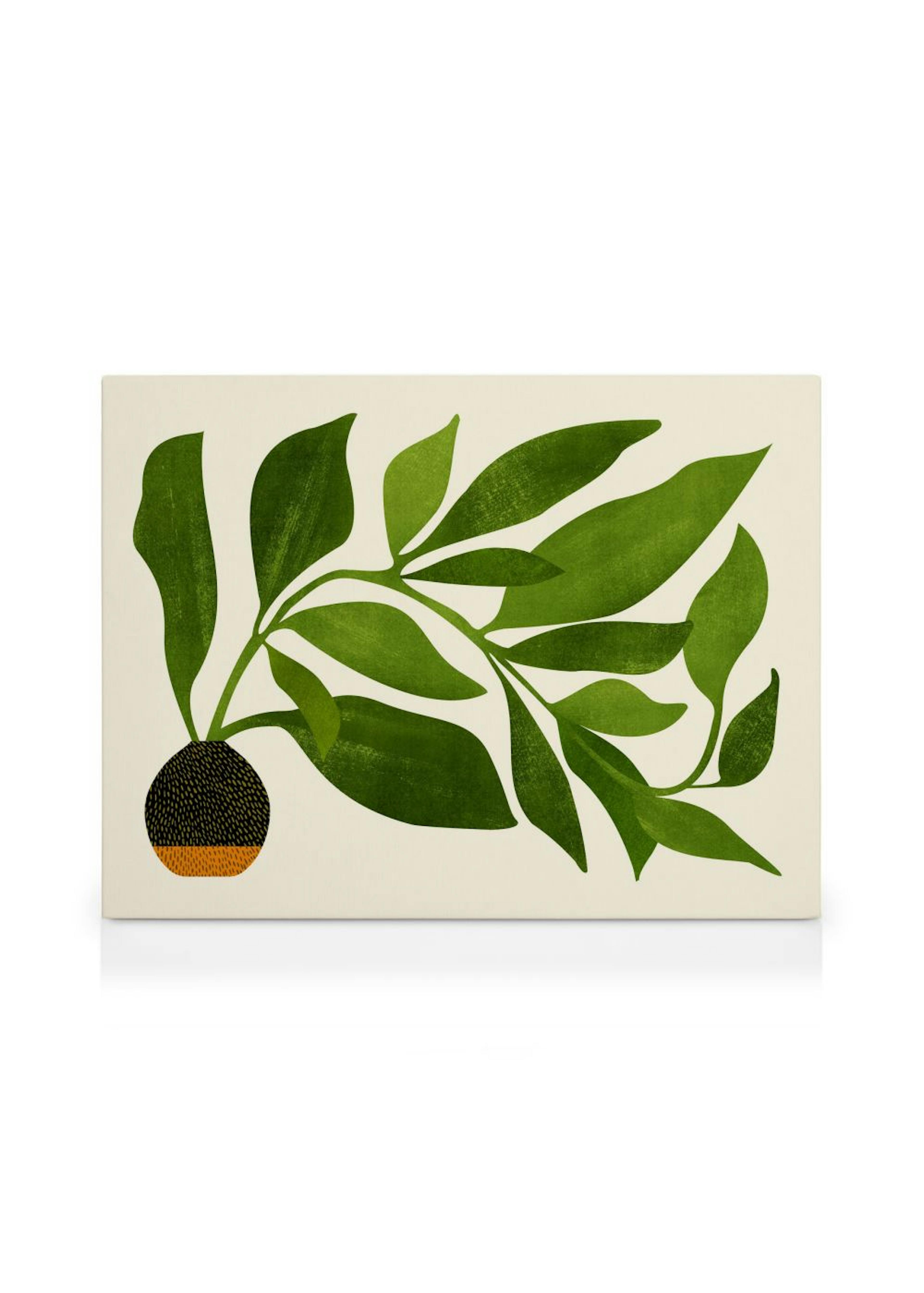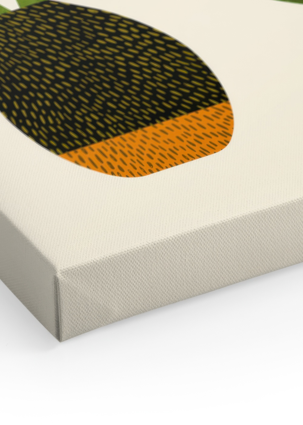 From £11.37A stylised canvas print illustrating green leaves and a textured round fruit against an off-white background. This canvas wall art features a simple design in green, beige, and gold colours.