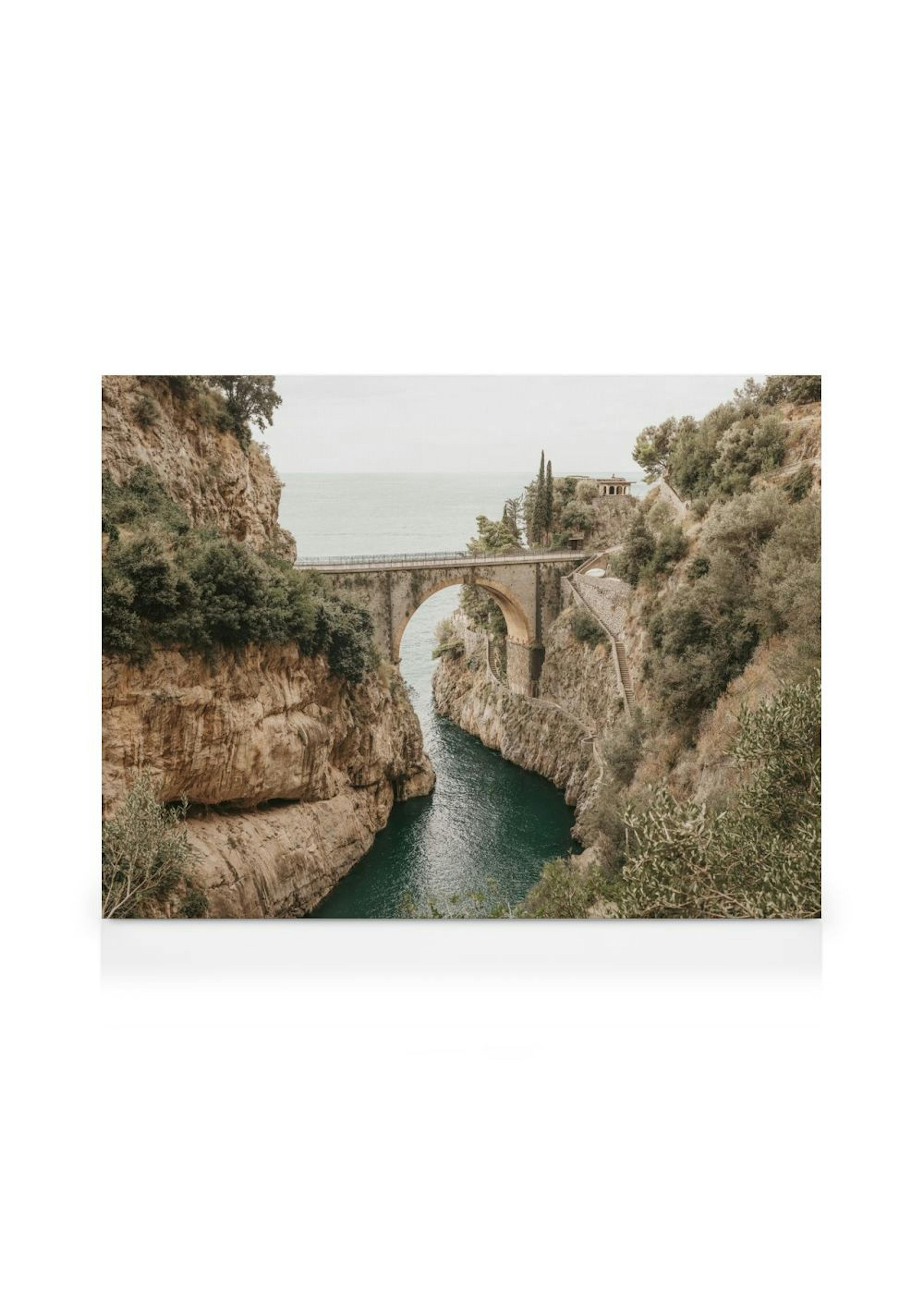 Canvas print illustrating a gorge in Italy, with turquoise water, green plants on the rocky walls, and an old stone bridge. A stunning wall art piece for any home.