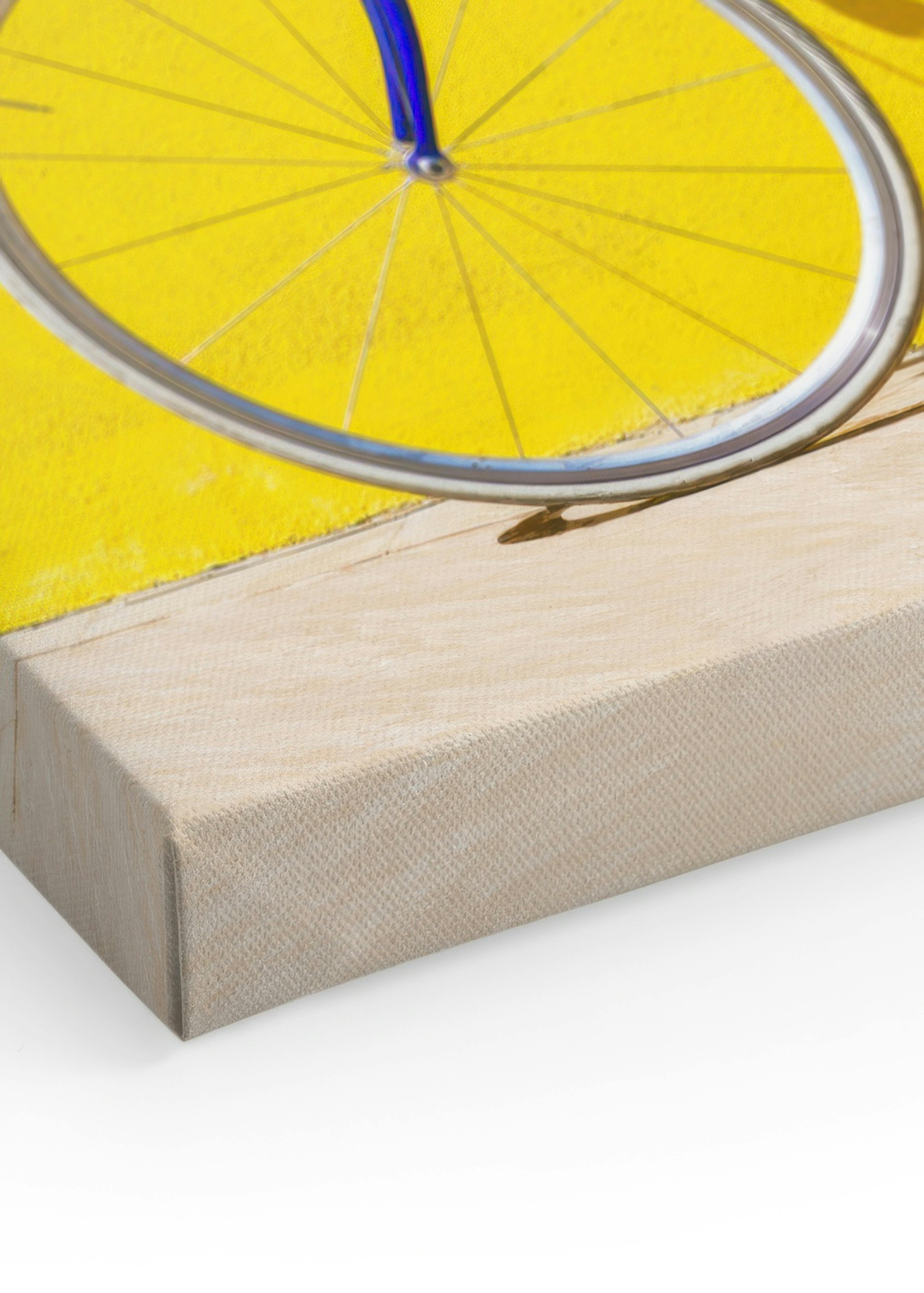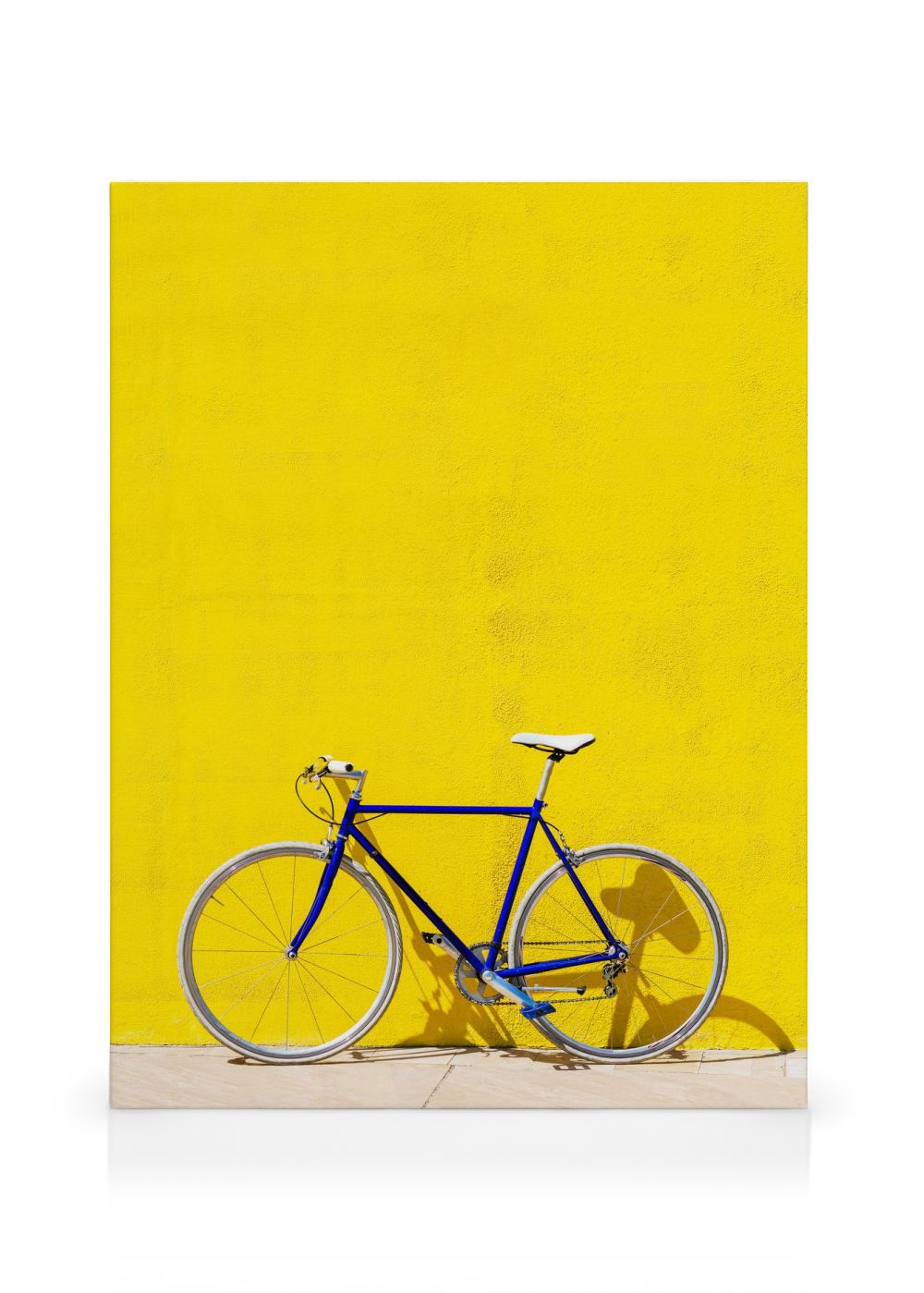 Beautiful canvas print featuring a blue bicycle leaning against a bright yellow textured wall. The bicycle has white tires and a white seat. A shadow is visible on the gray ground below.