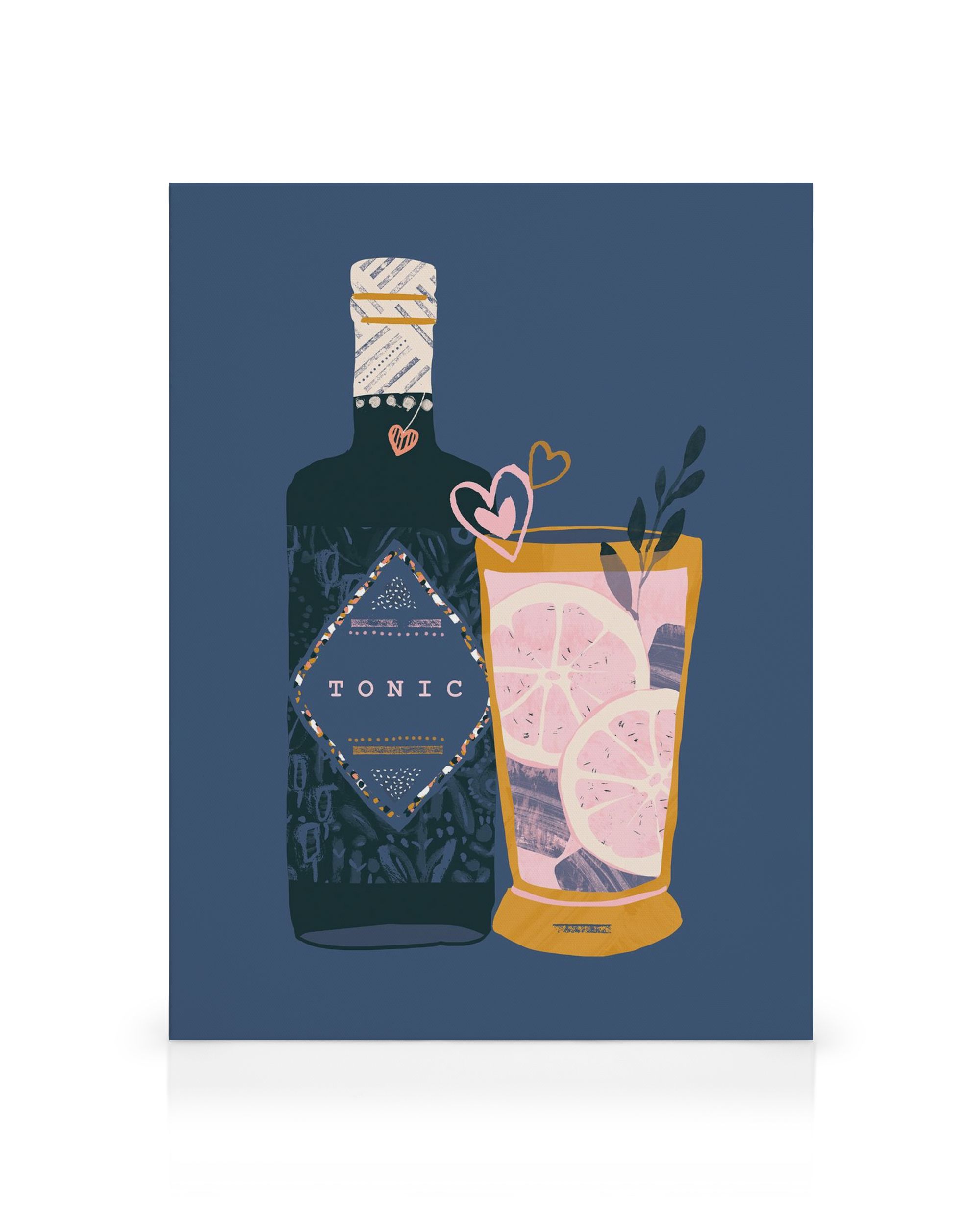 Canvas print illustrating a dark gin bottle and glass with slices of lemon on a pink and blue background.