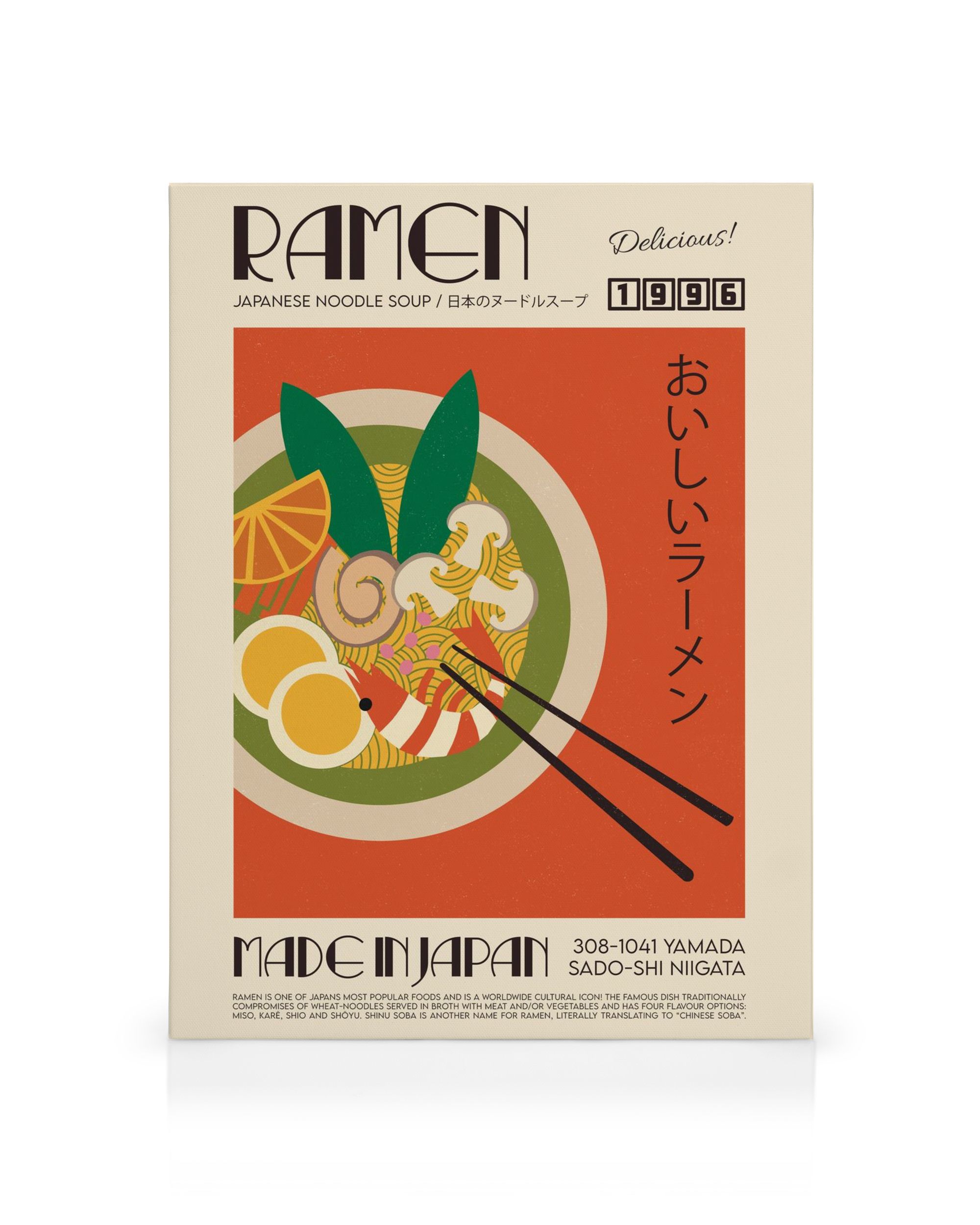 From £23.16Canvas print with "Ramen Japanese Noodle Soup" text above an illustration of ramen with egg, fish cake, greens and chopsticks, in red, green, yellow and beige.