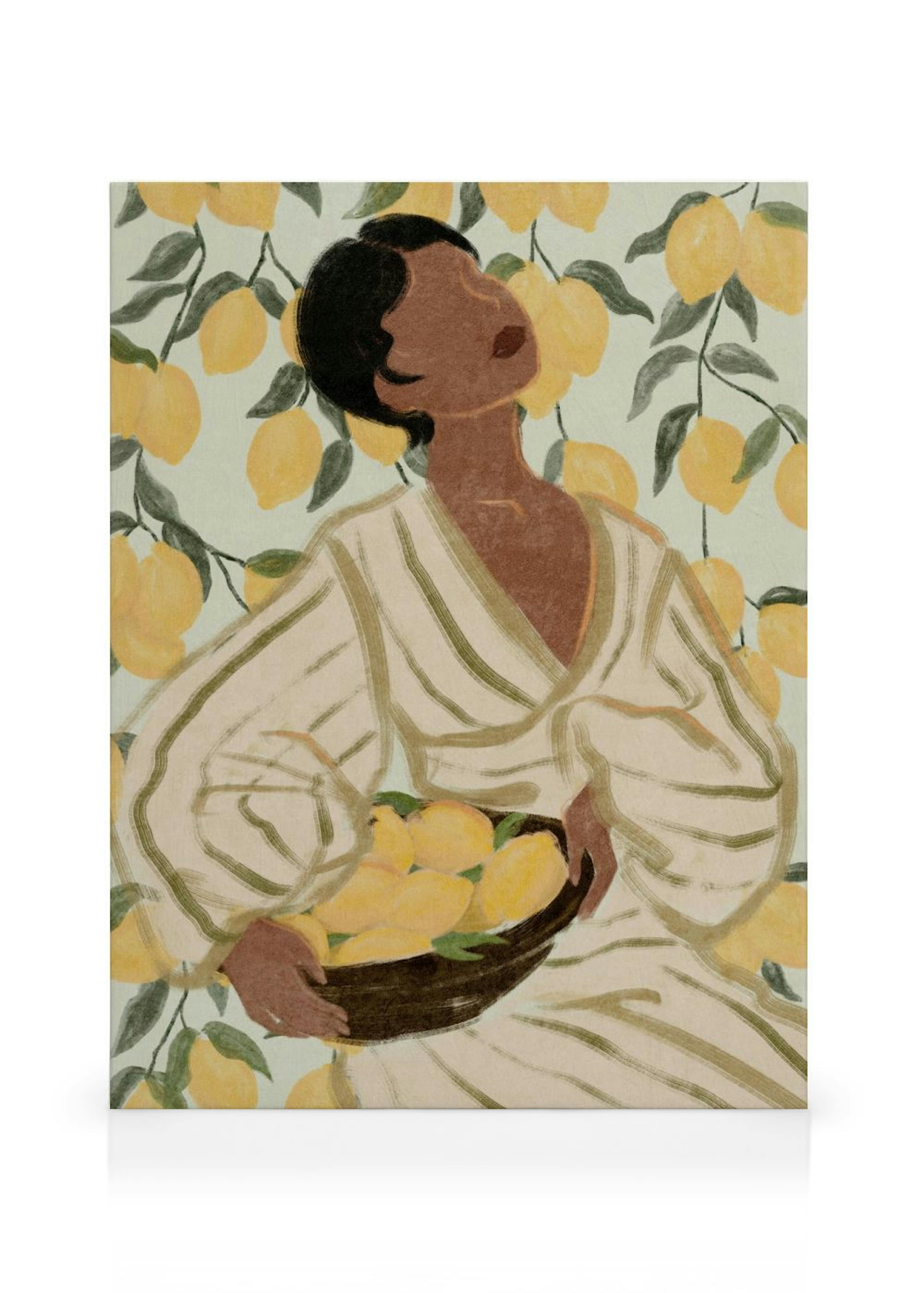 Lovely illustration of a person in a robe, holding a basket of lemons. Set against a lemon branch pattern for a charming citrus wall art canvas print.
