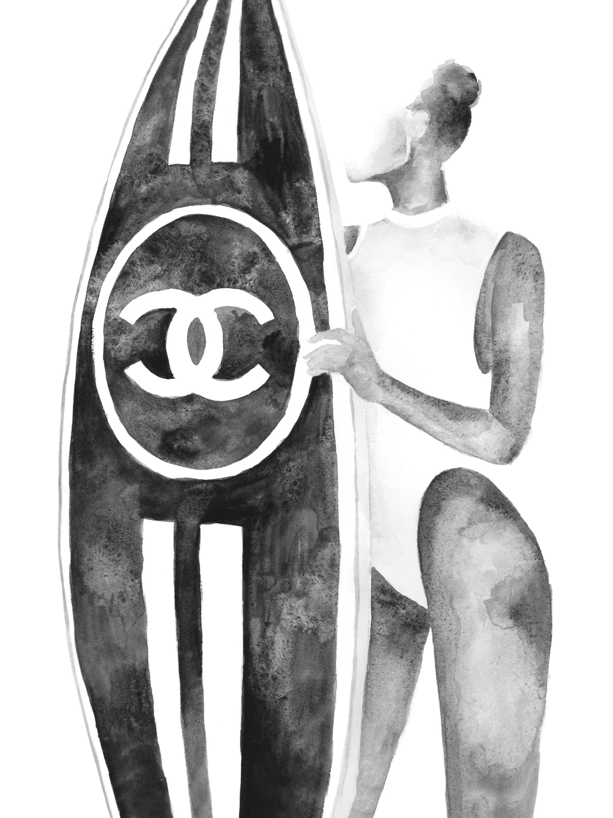 From £7.77Illustration in grey watercolour of a woman in a bathing suit, holding a surfboard with a Chanel logo, against a white background. Create a stylish corner in your bedroom with fashion prints. This style is perfect for the trendy and fashionable, who wants their art to reflect their style of living.