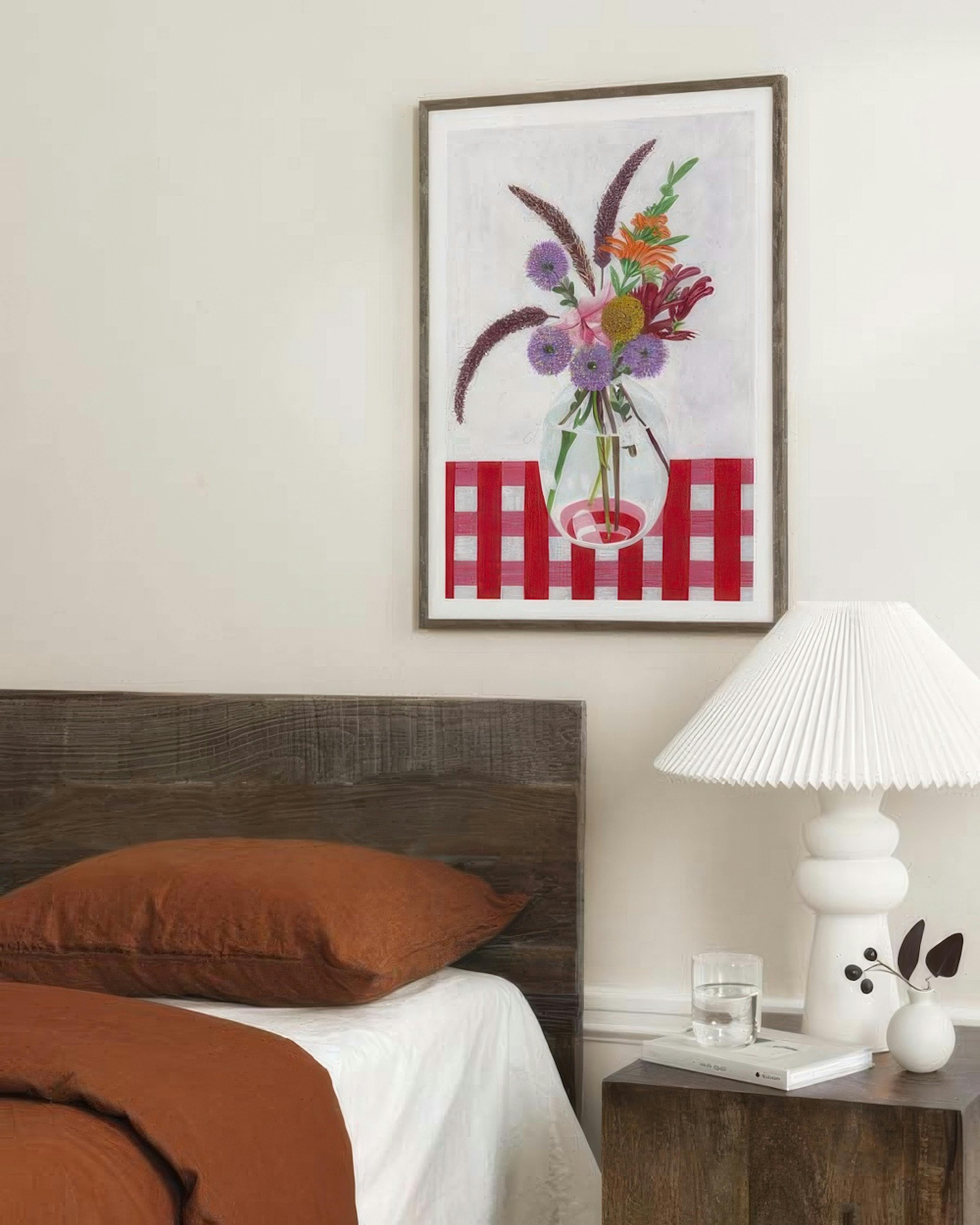 Illustration of a bouquet in several bright coloured flowers in a glass vase standing on a red squared table cloth. Beautiful poster with happy colours.
