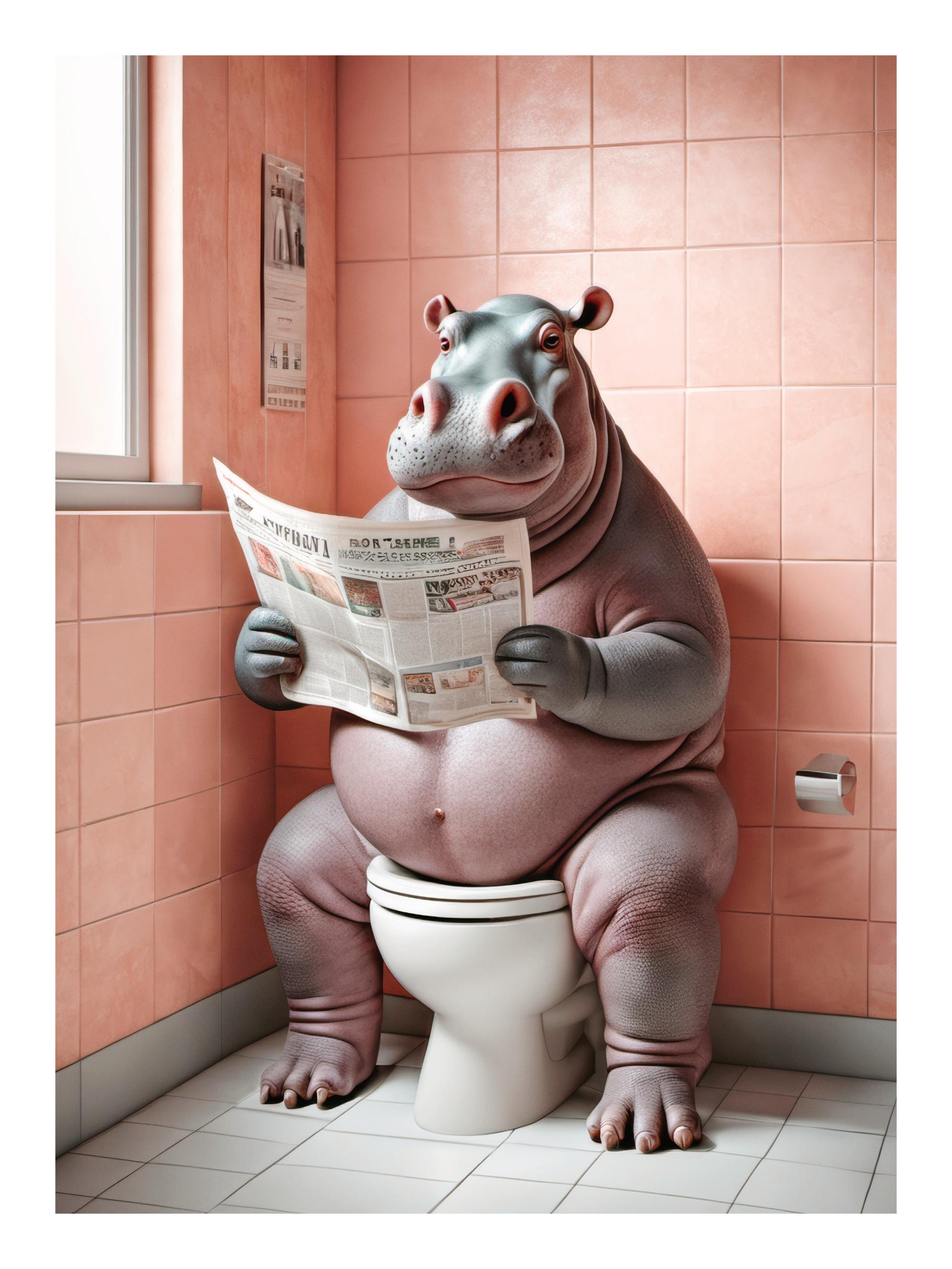 From £8.67Print of a hippo sitting on a toilet in a pink bathroom, reading a newspaper. A quirky print perfect for decorating your home.