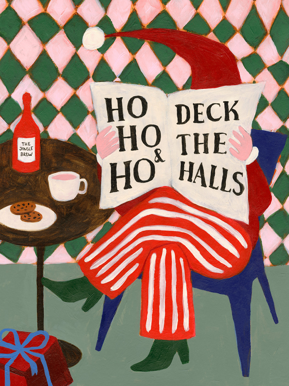 Festive print of an elf in red and white striped trousers reading a newspaper with "HO HO HO" and "DECK THE HALLS" text on a green and pink checkered background.