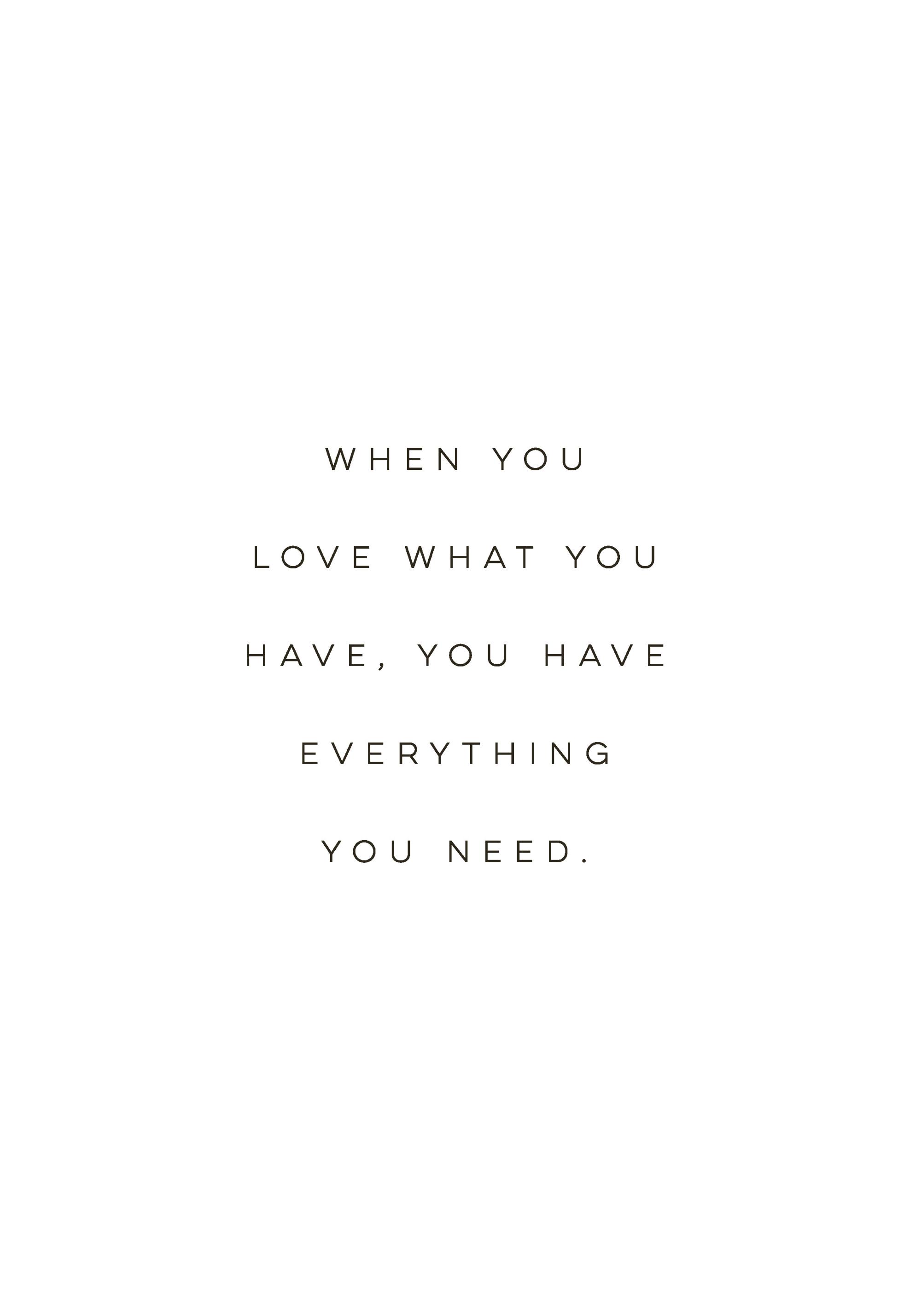 Text print with the quote 'When you love what you have, you have everything you need.' in black on a white background. Text and quote prints are a perfect way of giving your gallery wall a personal touch! Choose a quote you live by and you'll be reminded daily when laying eyes on it while walking by.